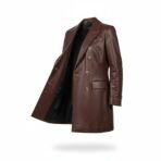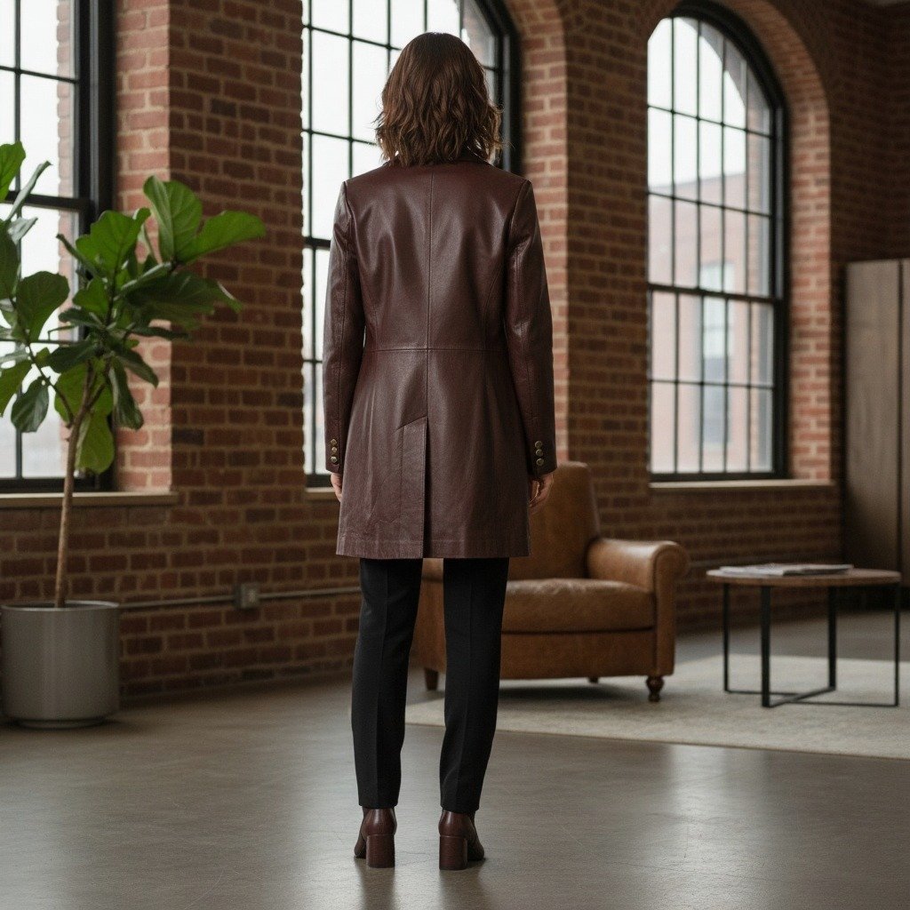 Women’s Brown Leather Long Blazer Coat – Double-Breasted Genuine Leather Jacket