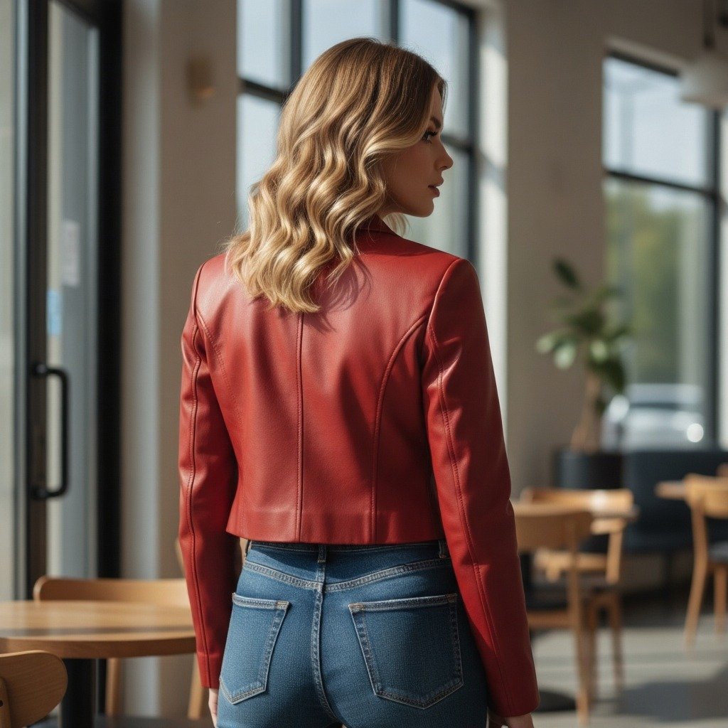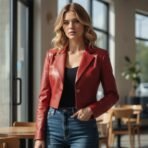 Women’s Red Leather Crop Blazer – Stylish Fitted Jacket with Single Button Closure